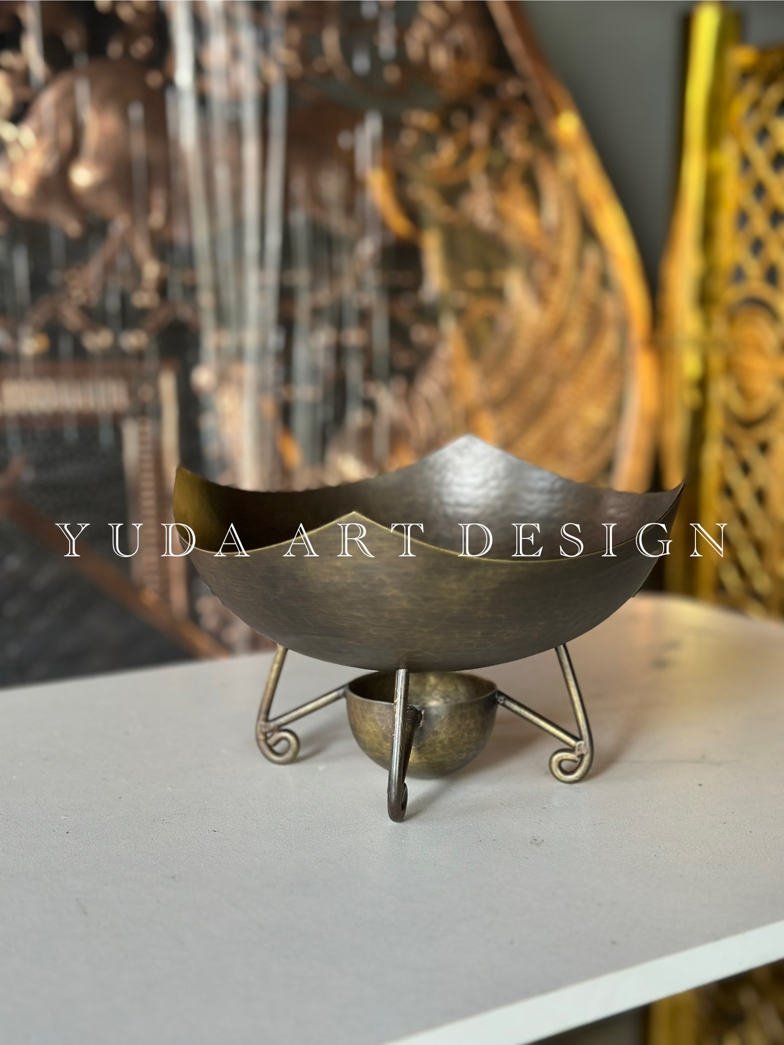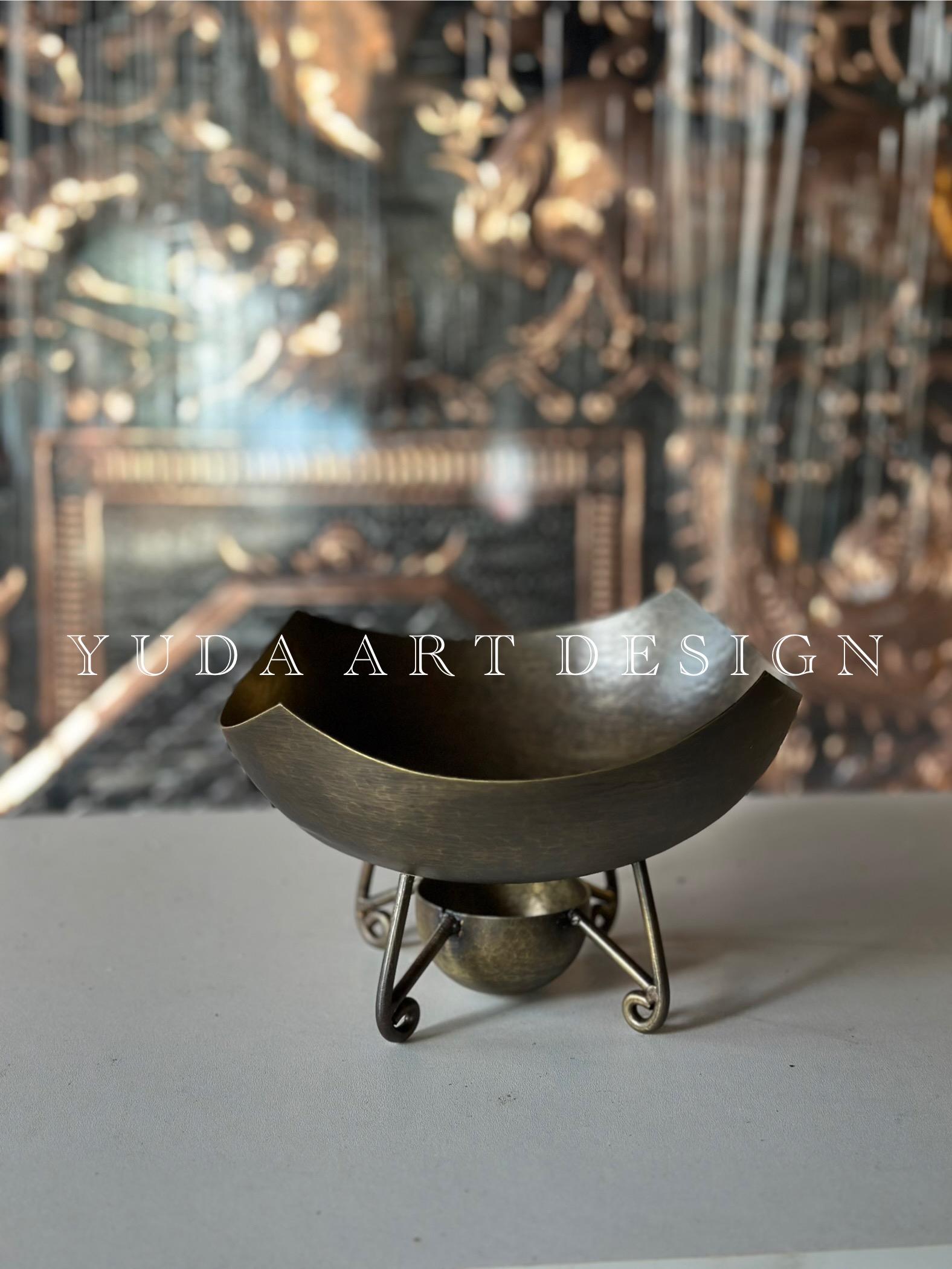 Kuningan sebagai bahan utama memberikan daya tahan tinggi serta warna khas yang membuat asbak ini berfungsi tidak hanya sebagai tempat abu rokok tetapi juga sebagai dekorasi menarik.
