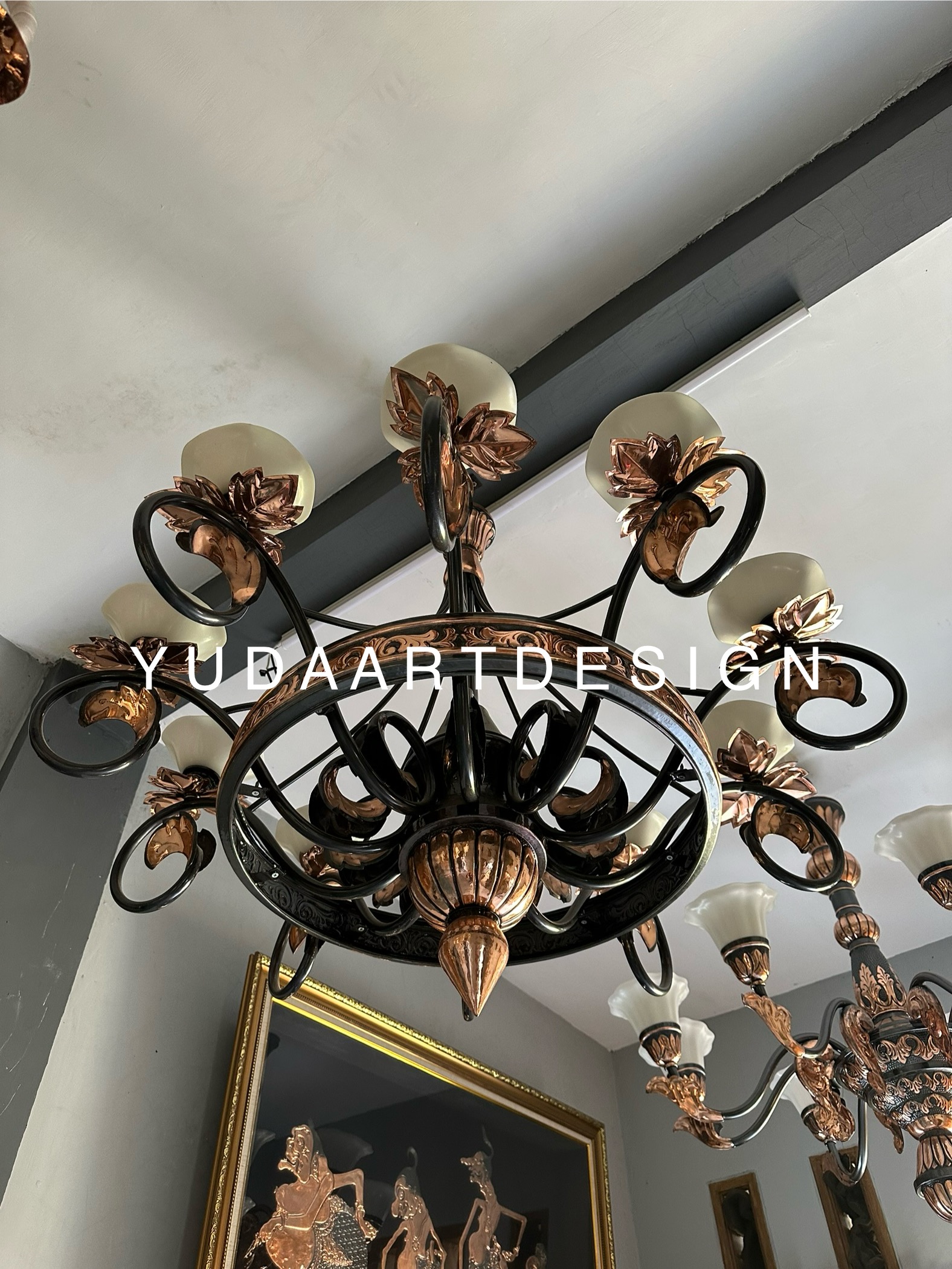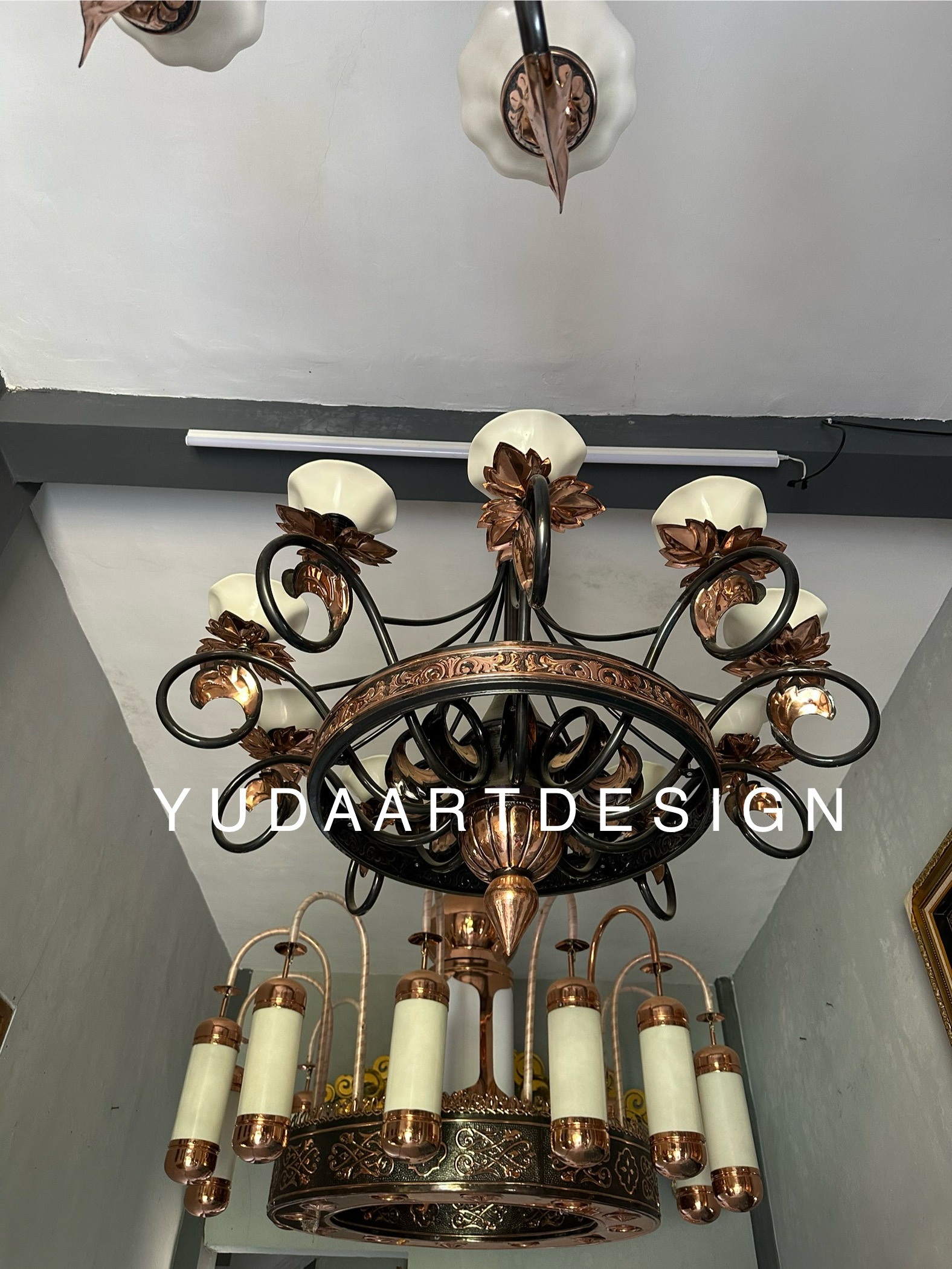 Gaya Klasik dan Chandelier: Di sisi lain, kami mampu membuat chandelier bertingkat dengan lengan ukiran rumit dari Tembaga tempa. Selanjutnya, kami mengaplikasikan finish cokelat antik yang memperkuat gaya klasik Eropa.