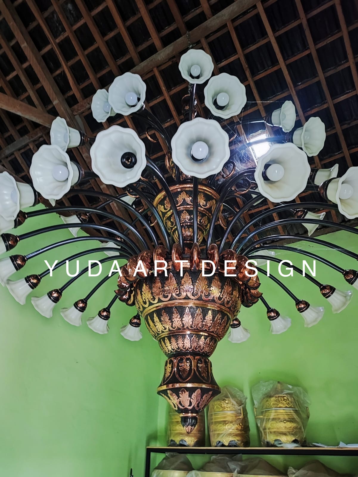 Nama Produk: Lampu Robyong Tembaga Megah – Desain Klasik Eksklusif Bahan: Tembaga murni kombinasi kuningan (opsional) Ukuran: Custom – mulai dari 1 meter hingga 5+ meter tinggi Finishing: Tembaga mengkilap, antik, atau oxidized (bisa custom) Desain: Model robyong klasik bertingkat dengan banyak cabang Teknik Pembuatan: Handmade – las, tempa, dan ukir detail Jumlah Cabang: Custom (mulai dari 9 hingga 30+ cabang) Fungsi: