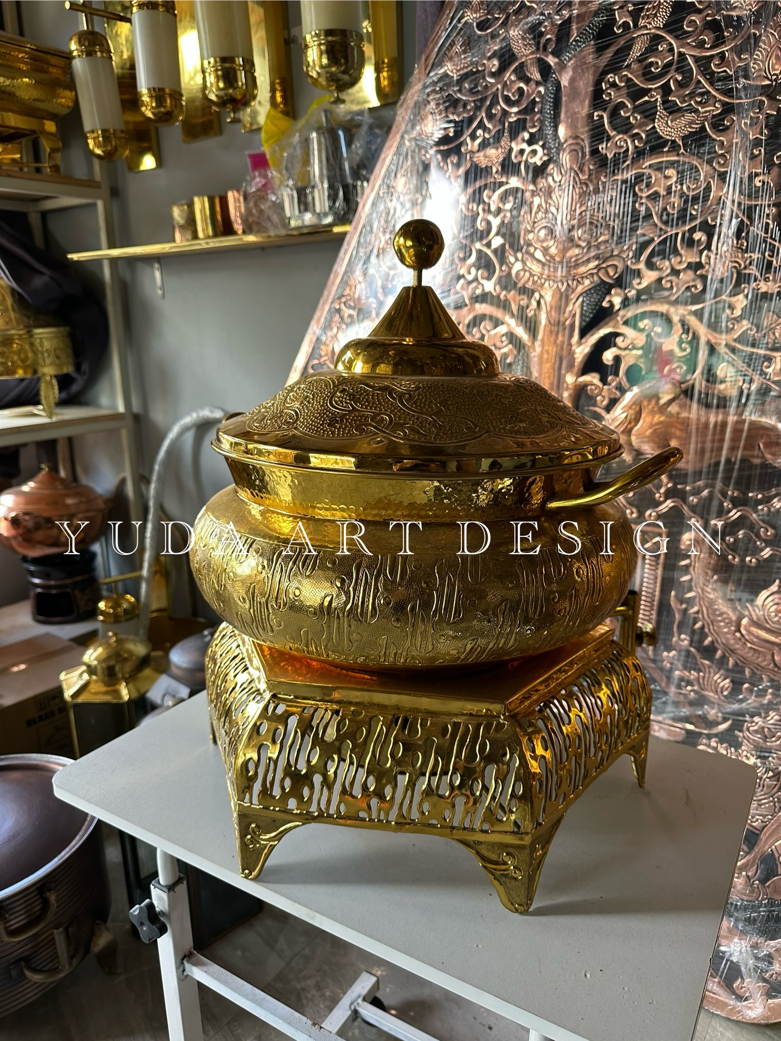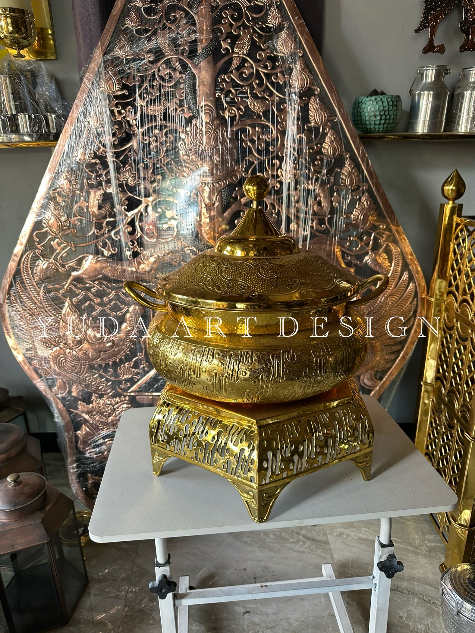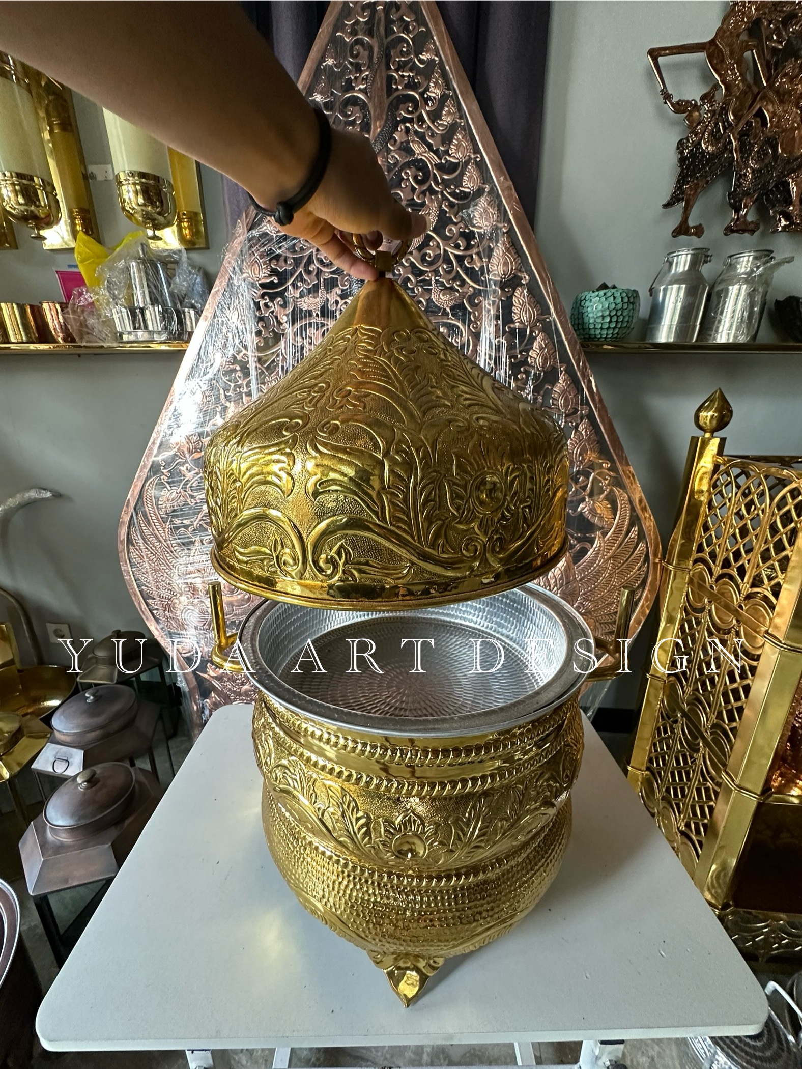 Kami membuat pemanas makanan kuningan secara handmade oleh pengrajin ahli. Pemanas ini membantu menjaga suhu makanan agar tetap hangat saat disajikan.