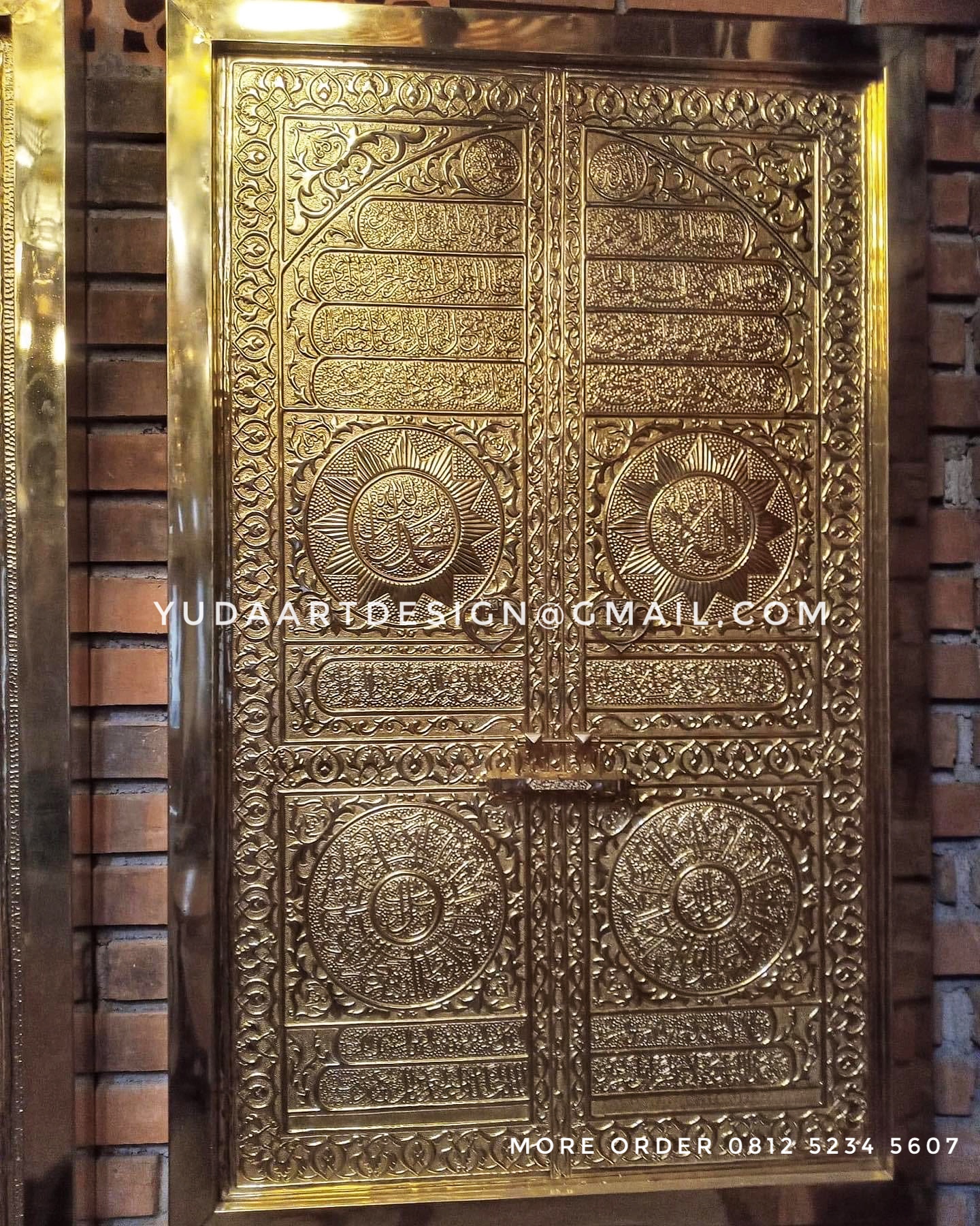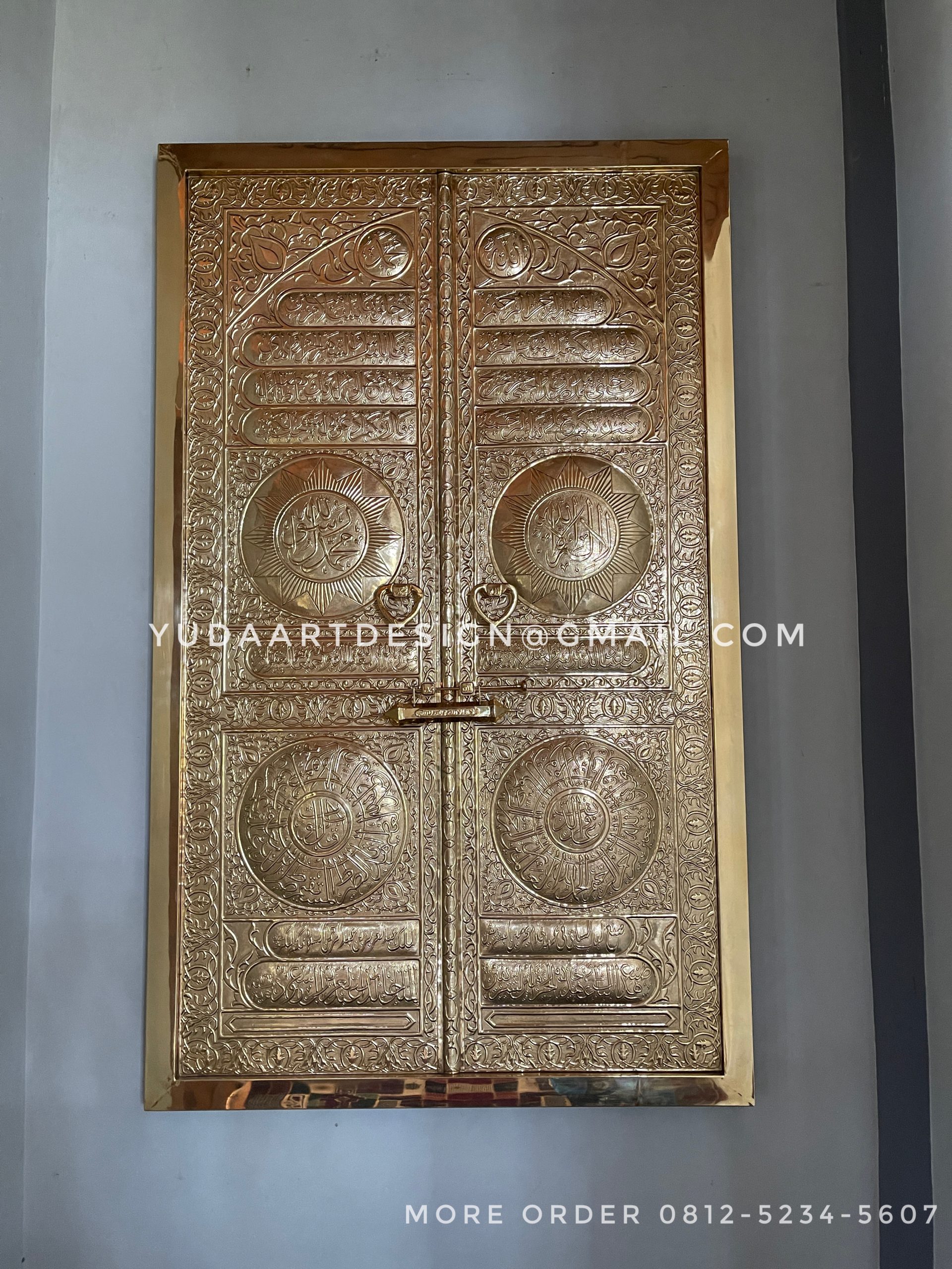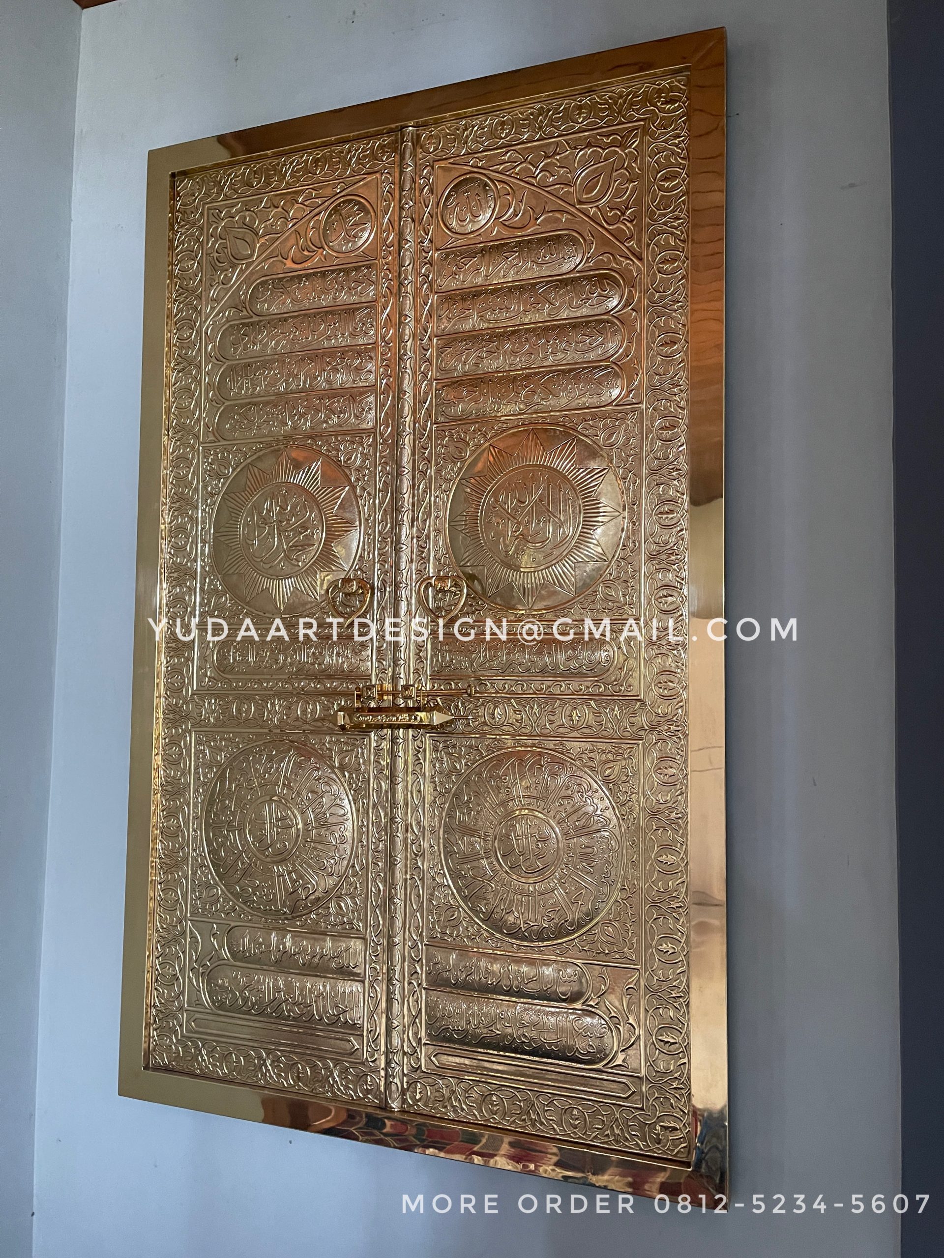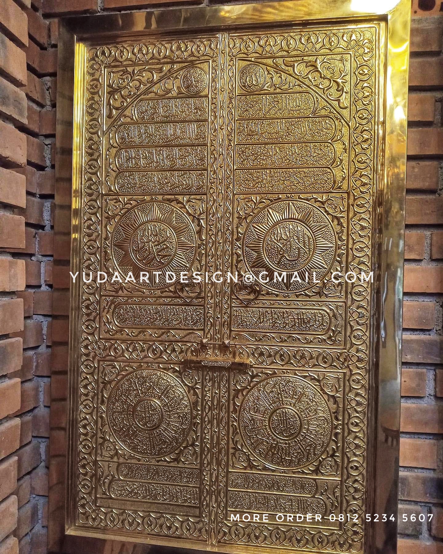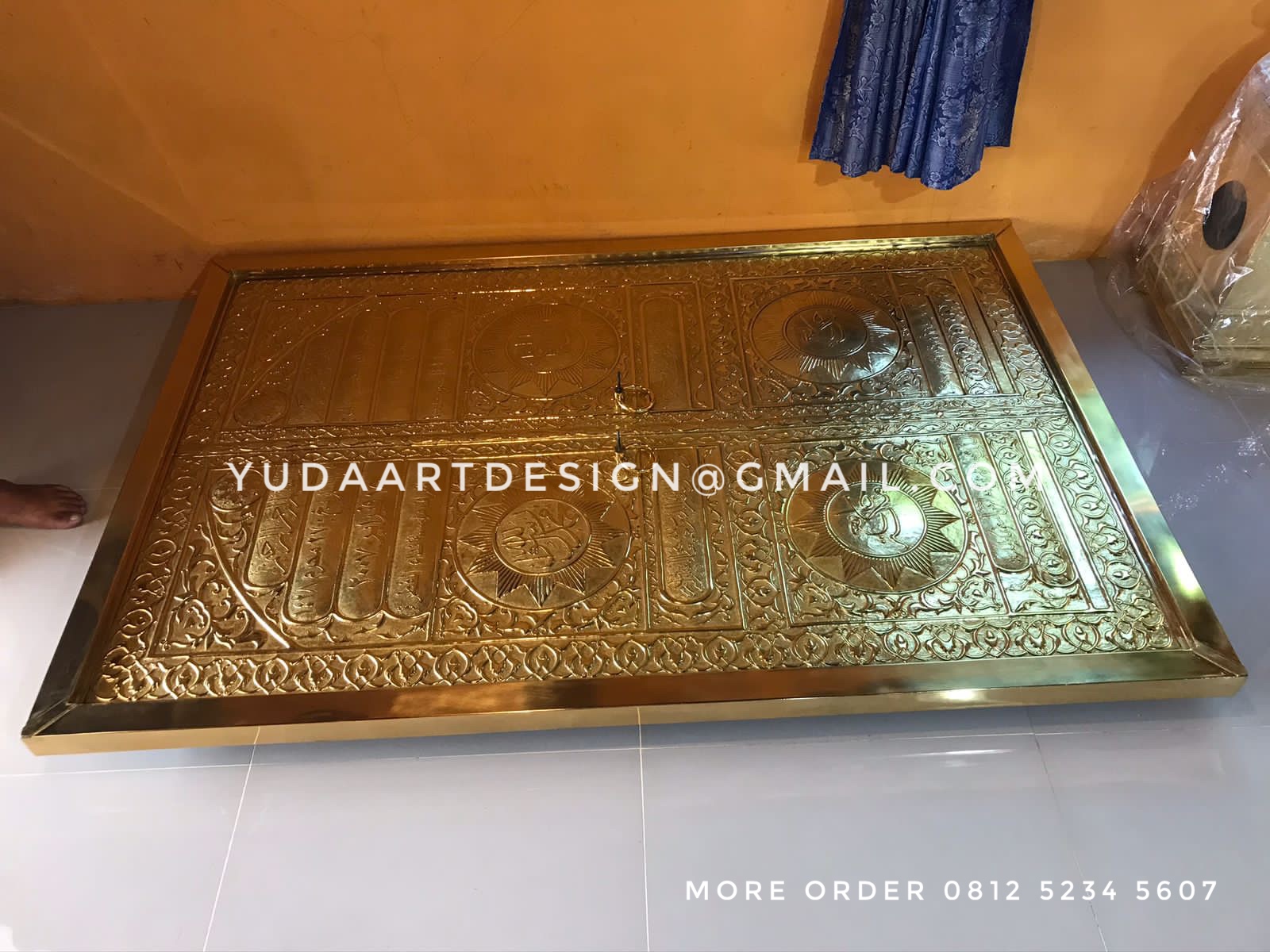 Kaligrafi Pintu Kabah Kuningan pesanan spesial dengan ukuran besar. Mihrab masjid akan sangat indah dan menawan jika di padukan dengan Kaligrafi Pintu Kabah Kuningan sebagai hiasan dinding di Mihrab Masjid. Pengiriman kaligrafi Pintu Kabah ukuran khusus ini bekerja sama dengan jasa pengiriman Indah Cargo. Terimakasih atas kepercayaan dan kerjasamanya sebagai pelanggan kami, Jazakumullah.