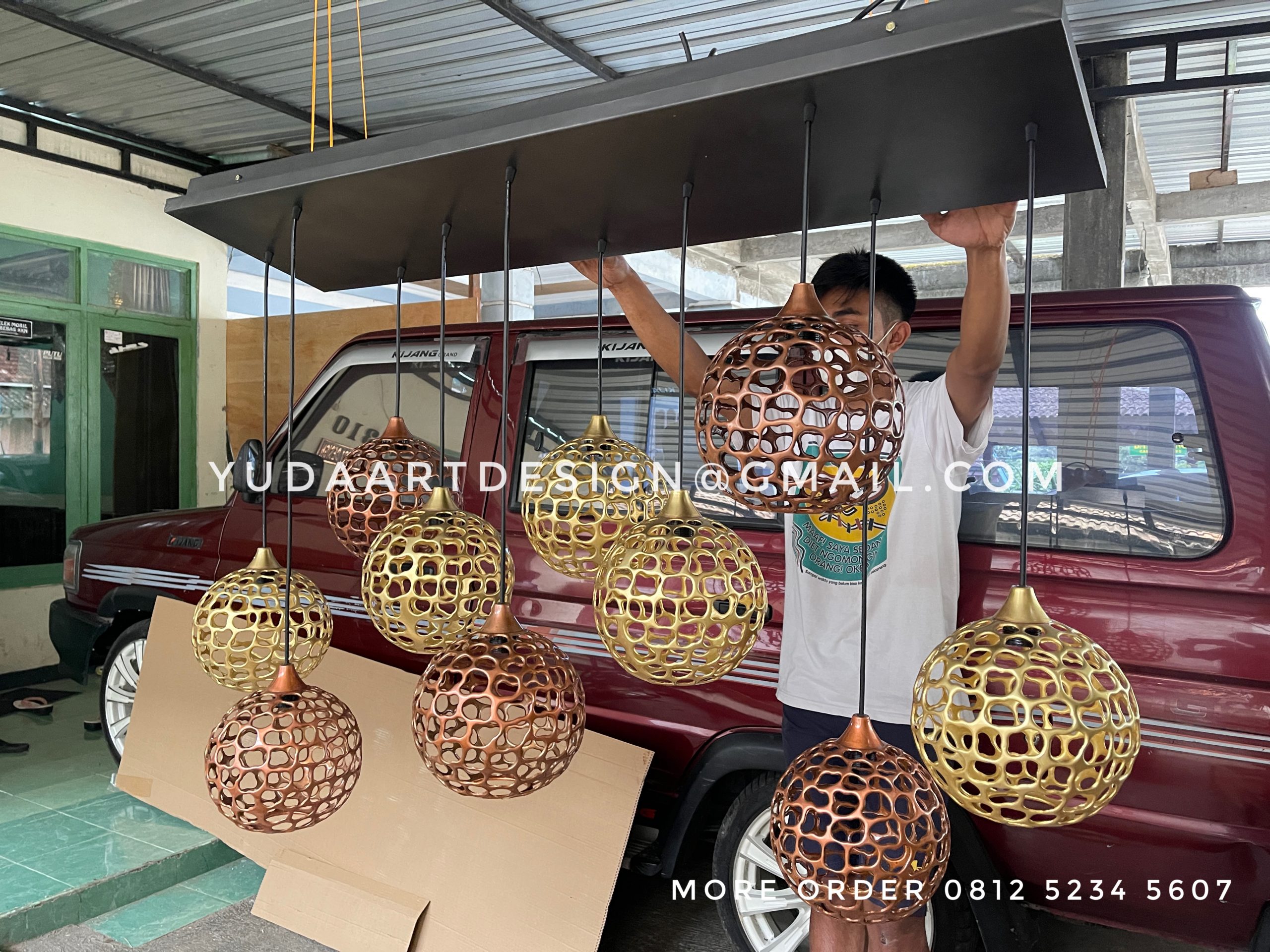 • **Chandelier Tembaga: Kami sarankan Anda memilih model chandelier bertingkat atau Lampu Robyong Tembaga dengan lengan dan banyak ornamen ukiran. Maka dari itu, lampu ini cocok untuk ruang tamu atau ruang makan formal.